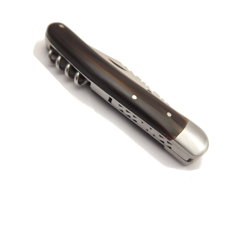 Couteau de poche classique doté d'un tire-bouchon. Le manche est en corne claire. Fourni avec son étui en cuir noir. Lame inox.
