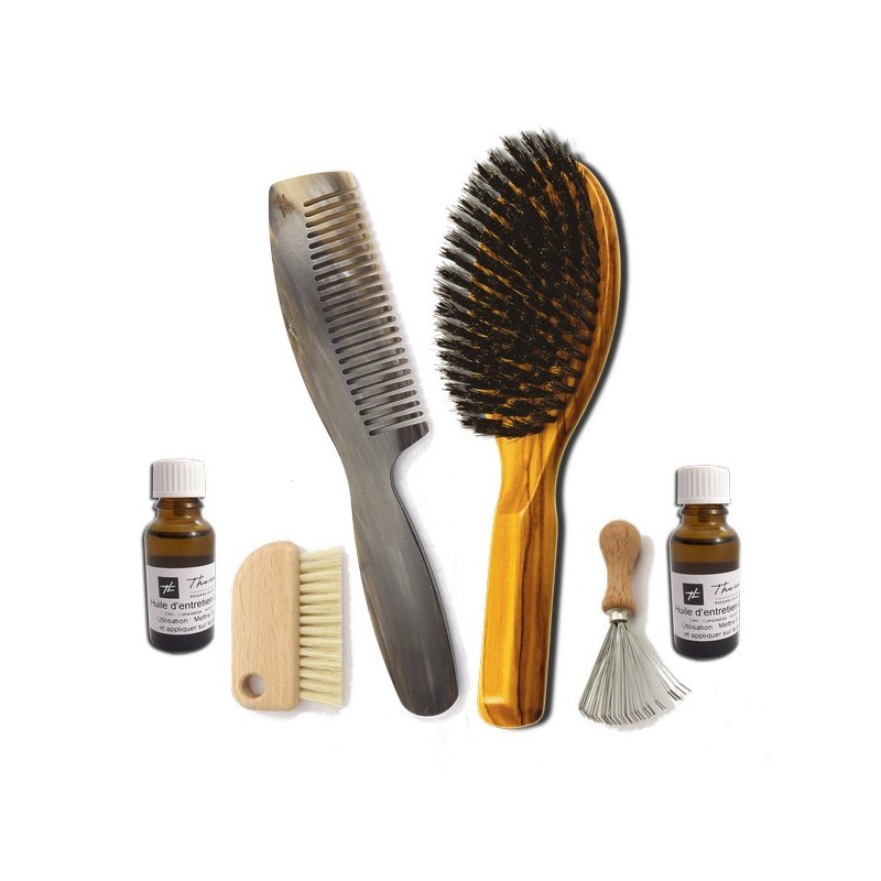 Le peigne en corne permet de démêler, de refermer la cuticule et d'enlever l'électricité statique. La brosse en poils de sanglier permet de dépoussiérer et répartir le sébum naturel.